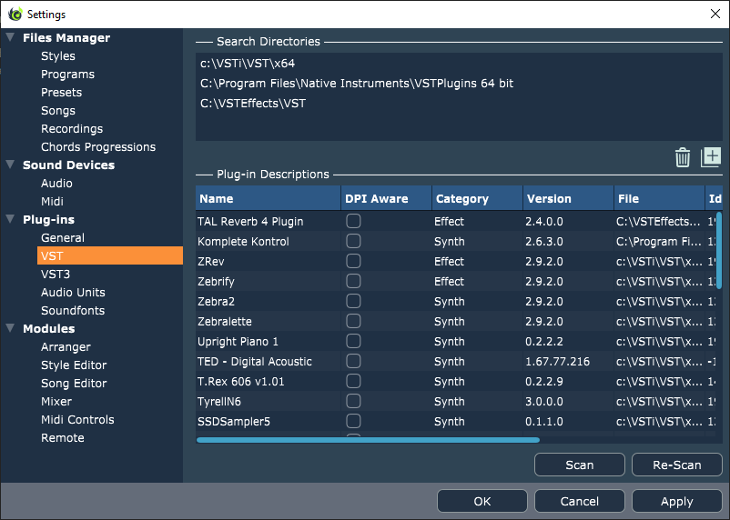 Here you need to select one or more directories where your VST plug-ins can be found. To add a directory, click on the Add button and select a directory which contains one or more VST plug-ins. To remove a directory, select it from the list and click on the Remove button. Please mind that no default directory is provided and the list is by default initially empty. After defining the directories, you need to press the scan button in order for the scan process to start. When completed, you will see the list of all the VST plug-ins which have been found and can be used.